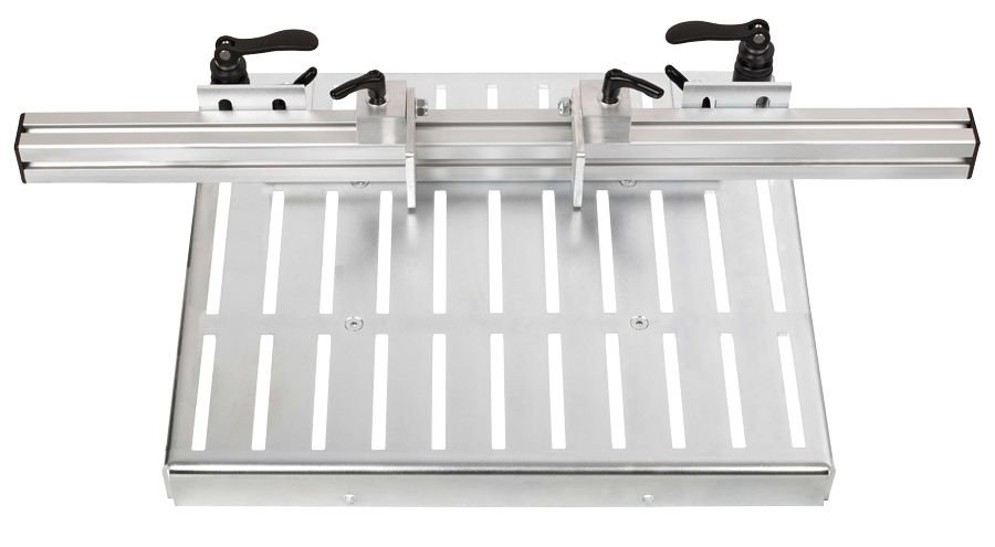 - Volitelné prodloužení stolu je připevněno k bočním montážním lištám a rozšiřuje upínací desku vlevo, vpravo nebo vpředu