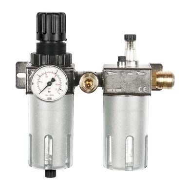 Obsahuje regulátor tlaku s filtrem s manuálním odváděním kondenzátu, manometr, olejový přimazávač a 2 rychlospojky.Obsahuje regulátor tlaku s filtrem s manuálním odváděním kondenzátu, manometr, olejový přimazávač a 2 rychlospojky.