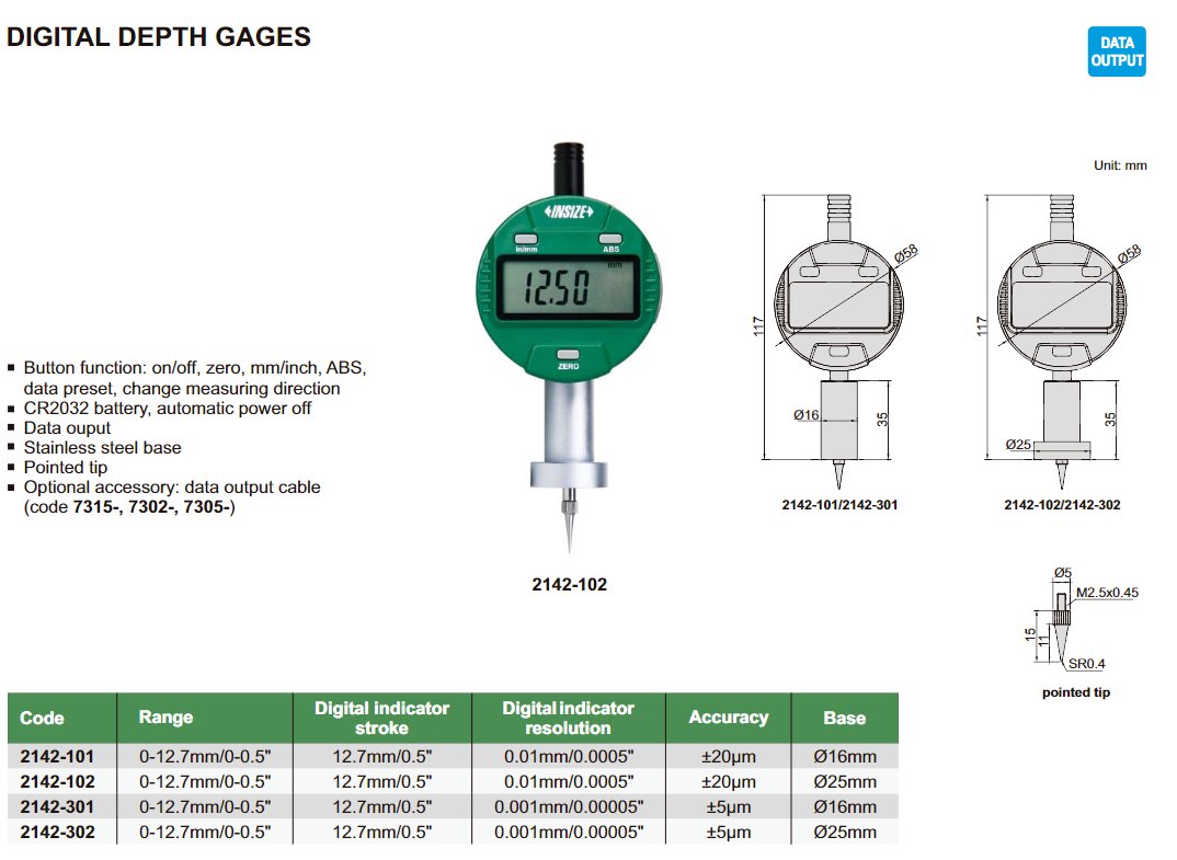 VÝPRODEJ INSIZE 2142-302 digitální hloubkoměr 12,7mm/0,5" / 0,001mm s kruhovou základnou 25mm