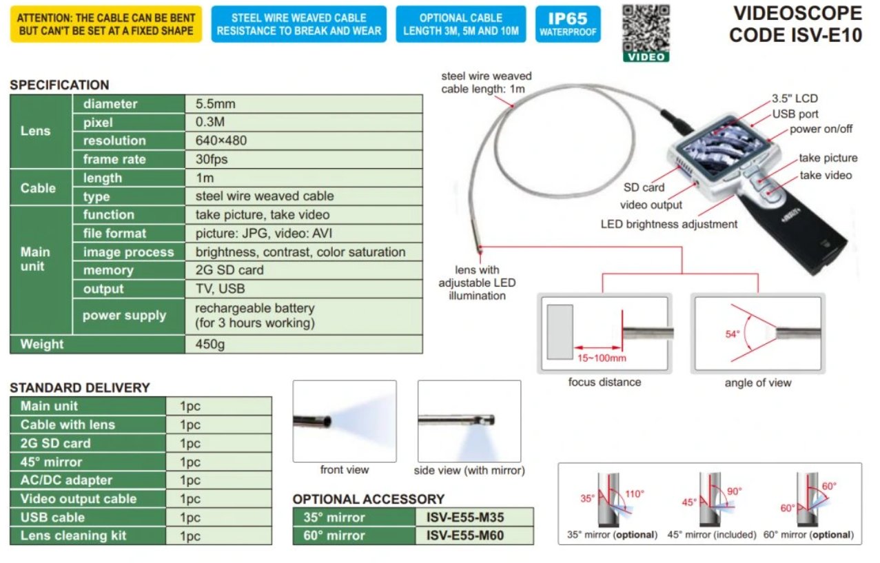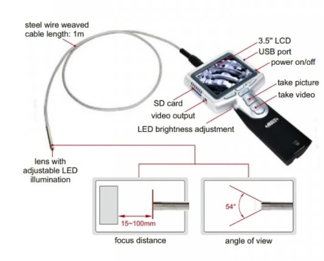 objektiv: průměr: 5,5mm Pixely: 0,3M Rozměry: 640x480 snímková frekvence: 30fps Kabel: Délka: 1m typ: obalené ocelovým drátem Hlavní jednotka: Funkce: obrázky,video Formát souboru : JPG , VIDEO , AVI Obrázky: Jas,kontras,sytost barev pamět: 2GB SD karta Připojení: TV,USB Napájení: Dobíjecí baterie(pro 3 hodiny práce) Váha: 450g