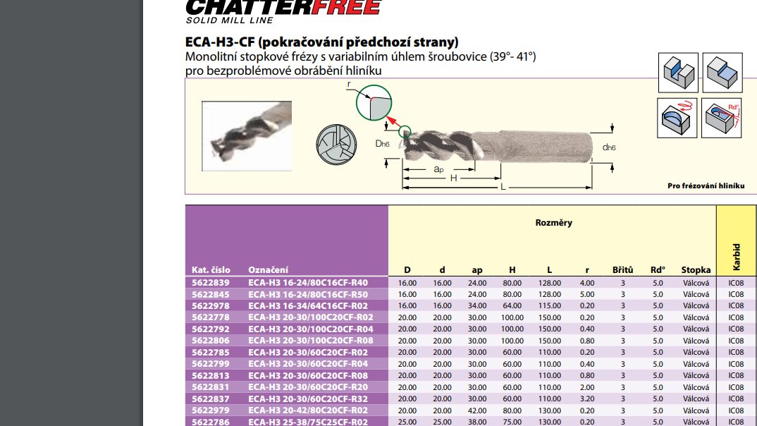 Monolitní stopková fréza s variabilním úhlem šroubovice (39°- 41°)pro bezproblémové obrábění hliníku.