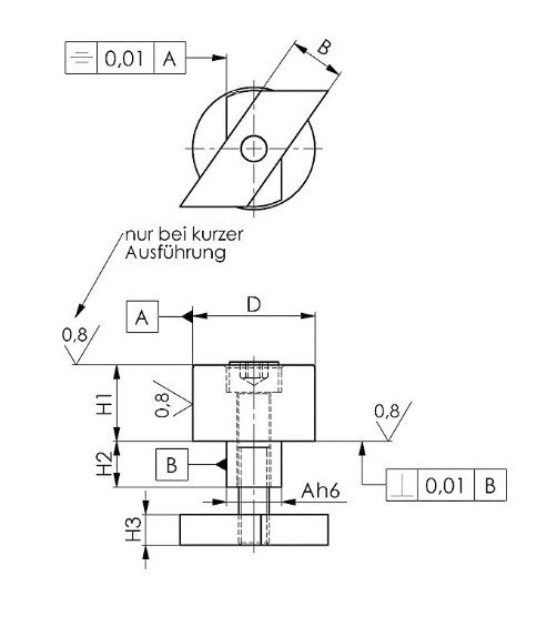 Válcový doraz, cementovaný a broušený. Krátká verze, broušená s tolerancí výšky ±0,01 mm, může být použita jako podpěra. Technická specifikace: Drážka: 12 A h6: 0-0,011… Více