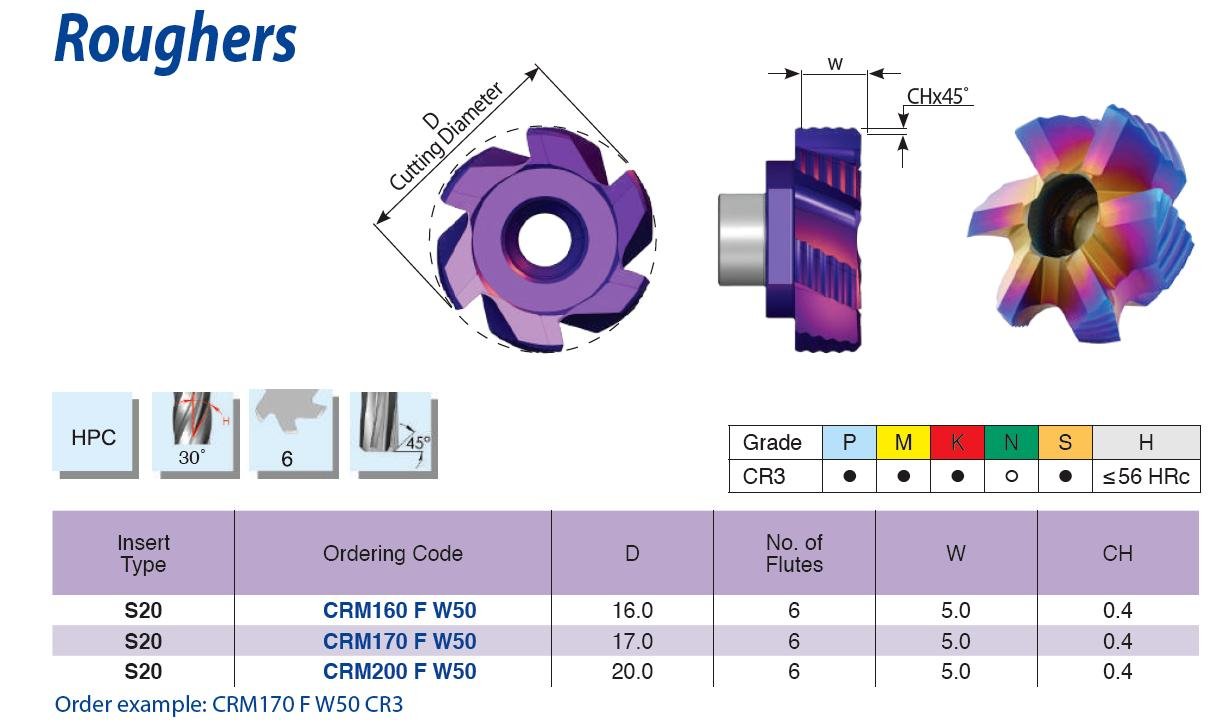 Výměnná břitová destička CRM je určena pro obrábění ( hrubování ) materiálů skupin P, M, K, S, H ( do 56 HRC )