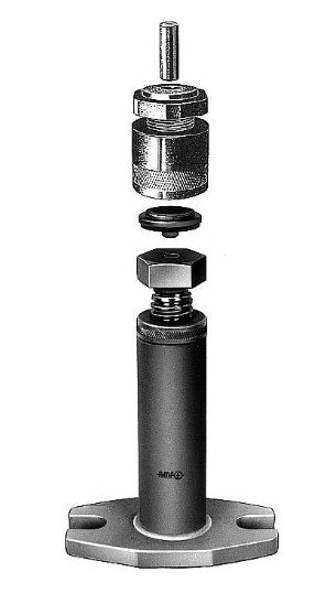 Vyrovnávací šroubovací podpěrka s válcovým kolíkem ISO8734-12x50 a středicím otvorem Ø12 mm je ideální pro přesné nastavení výšky obrobků. Vřeteno s metrickým jemným závitem M30x1,5 a koncovou zarážkou je vyrobeno ze zušlechtěné černěné oceli, kluzná vložka je vedena v nalisovaném kluzném pouzdře. Podpěrka je kompatibilní s nástavci č. 6440, 6441 a 6442 a vhodná je i s podpěrou č. 6442G.