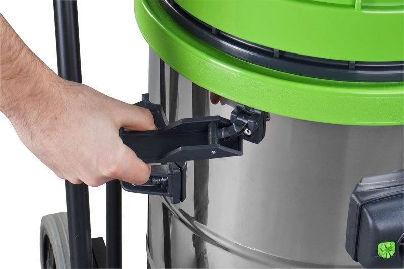 Antistatický vysavač pro vysávání prachu a jiných pevných částic s nerezovou nádobou. Vestavěná zásuvka pro připojení elektrického nářadí s automatickým spuštěním při zapnutí nářadí. S automatickým elektromagnetickým oklepem filtru. Odpovídá normě pro vysavače třídy M.