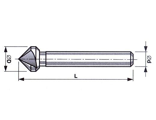 Nástroje na obrábění otvorů Provedení: Materiál: výkonná rychlořezná ocel HSS, tři přímé zuby. Použití: Pro odstraňování ostřin, srážení hran, zahlubování otvorů pro šrouby se zápustnou hlavou ve výrobcích z ocelí, litiny, barevných a lehkých kovů i nekovových materiálech.