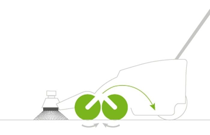 - Dva boční kartáče zametají odpad před válce, které jej nasypou do nádoby