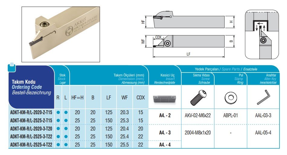 Tělo nástroje je vyrobeno z kvalitní oceli. VBD je upevněna standardním způsobem shora pomocí šroubku což zajišťuje stabilní upnutí řezné destičky. Pro nože AKKO jsou používány kované upínky a šroubky z produkce Švýcarského výrobce SFS. Tyto držáky jsou opatřeny povlakem stříbrné barvy, který zajišťuje korozivzdornost a dostatečnou odolnost proti vnějším vlivům.