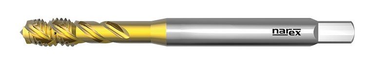 Strojní závitník pro metrický závit se šroubovitou drážkou, DIN 371, povlak TiN vhodný pro konstrukční oceli, nelegované oceli, automatové oceli, alternativně tvárnou a temperovanou litinu, slitiny hliníku.