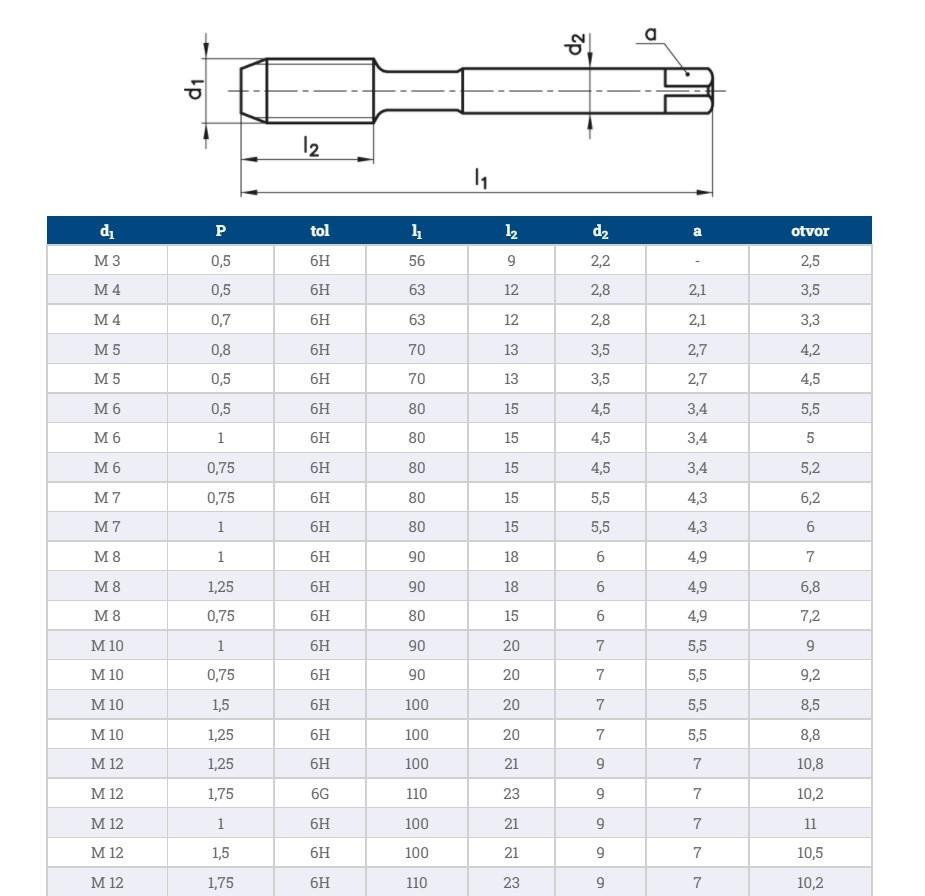 Strojní závitník pro metrický a jemný metrický závit s přímou drážkou a lamačem třísek, DIN 376, DIN 374, vhodný pro konstrukční oceli, nelegované oceli, automatové oceli, alternativně slitiny mědi tvořící krátkou třísku, tvárnou a temperovanou litinu, slitiny hliníku s Si<10%.