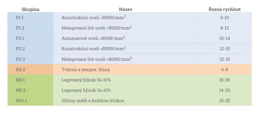 | Druh obráběného materiálu | Litina, Neželezné kovy, Ocel |
