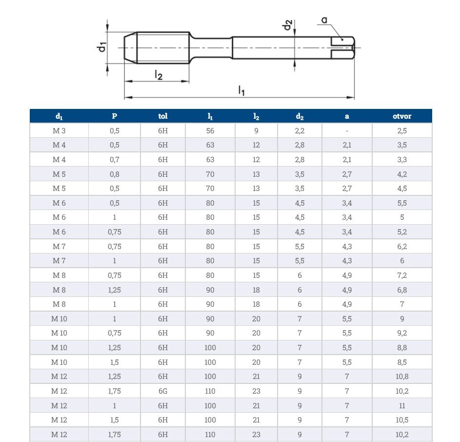 Strojní závitník pro metrický a jemný metrický závit s přímou drážkou a lamačem třísek, DIN 376, DIN 374, vhodný pro konstrukční oceli, nelegované oceli, automatové oceli, alternativně slitiny mědi tvořící krátkou třísku, tvárnou a temperovanou litinu, slitiny hliníku s Si<10%.