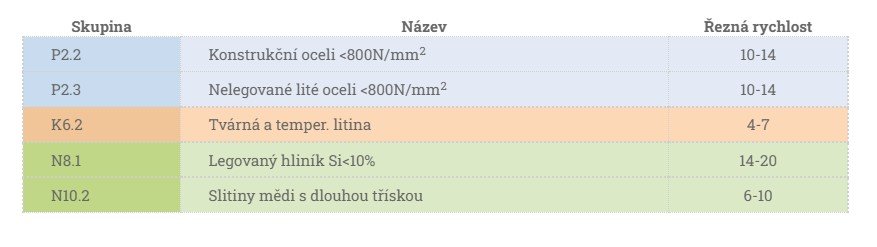 | Druh obráběného materiálu | Litina, Neželezné kovy, Ocel |