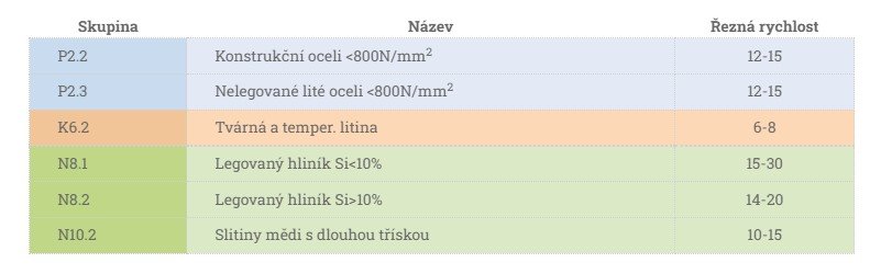 Druh obráběného materiálu Litina, Neželezné kovy, Ocel