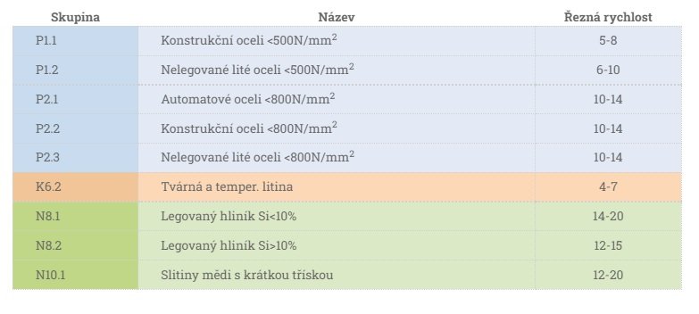 | Druh obráběného materiálu | Litina, Neželezné kovy, Ocel |