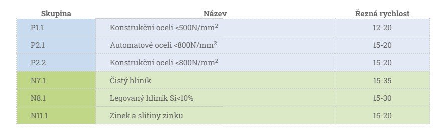| Druh obráběného materiálu | Litina, Neželezné kovy, Ocel |