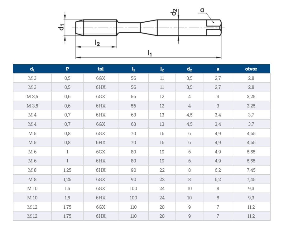 Tvářecí závitník pro metrický závit, DIN 2174, povlak TiN, pro slitiny zinku, alternativně pro konstrukční oceli, nelegované oceli, automatové oceli, čistý hliník a jeho slitiny s Si<10 %