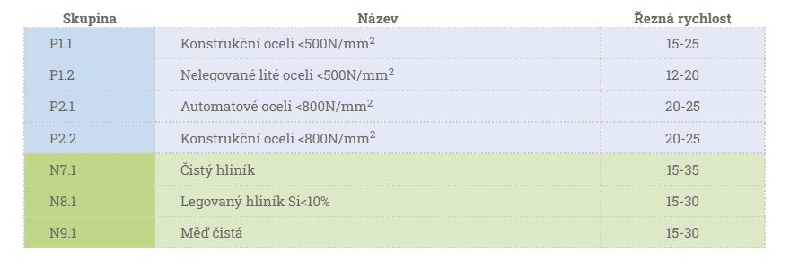 | Druh obráběného materiálu | Litina, Neželezné kovy, Ocel |