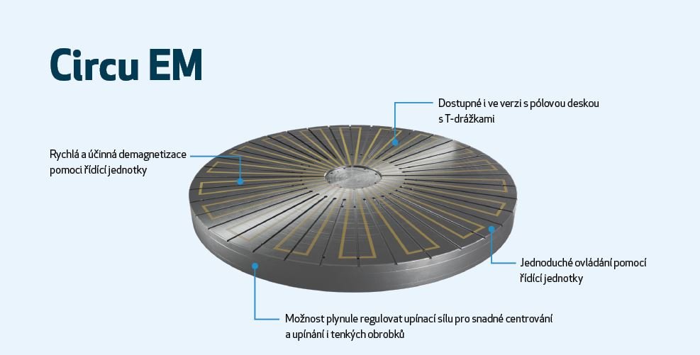 Circu EM je elektromagnetický upínač s radiálním uspořádáním pólů určený k instalaci na otočných stolech brusek