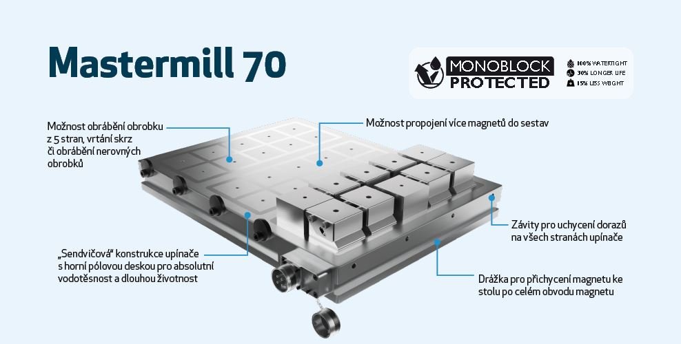 Hledáte-li výkonný magnetický upínač vhodný pro náročné frézování a vrtání středních až větších obrobků, zaměřte se na Mastermill 70SQ.