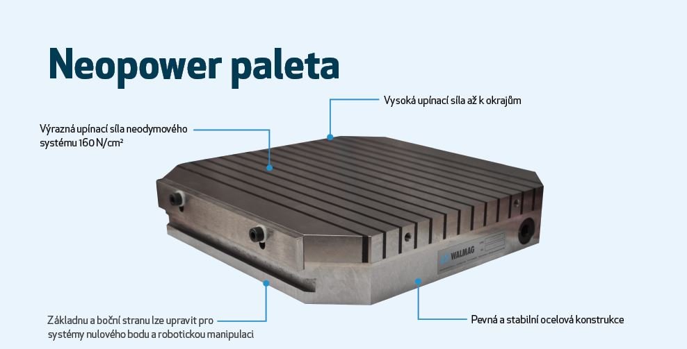 Magnetický upínač Neopower paleta využijete k upínání středně velkých až velkých komponentů na automatických obráběcích centrech.