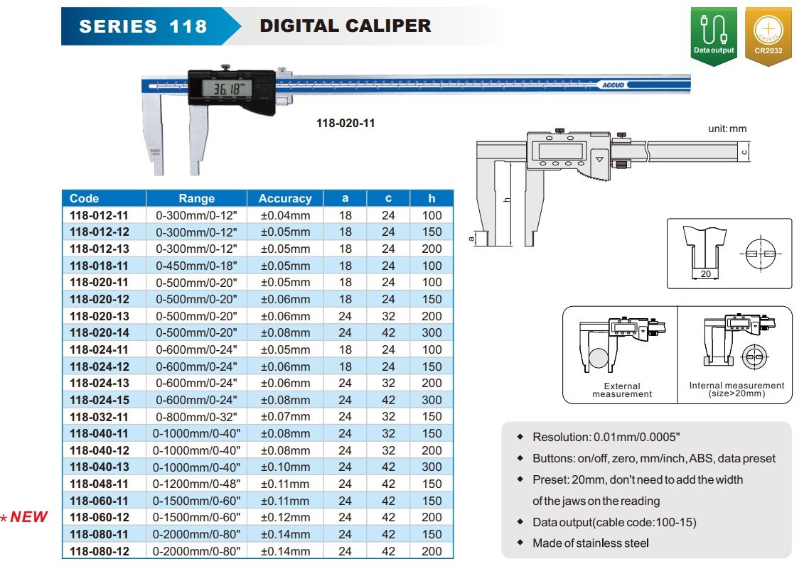 ACCUD 118-018-11 DIGITAL CALIPER 450mm/0-18" ( jaw length 300mm ) NO UPPER JAWS, ABS ( 0.01mm/0.0005" )