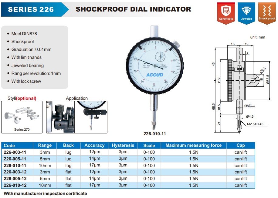 ACCUD 226-005-12 SHOCKPROOF DIAL INDICATOR 0-5mm ( 0,01mm ) FLAT BACK