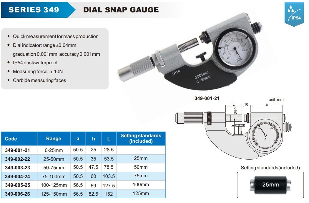 Dial snap gauge Technical specification: Range: 125-150mm Quick measurement for mass production Dial indicator: range ±0.04mm, graduation 0.001mm, accuracy 0.001mm IP54 dust/waterproof Measuring force: 5-10N Carbide measuring faces Dimensions: For more product… Read more