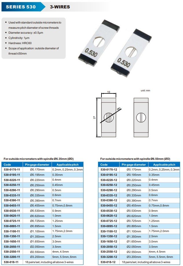 Thread measuring wires are designed for use with standard outside micrometers to measure the pitch diameter of screw threads using the 3-wire method. Technical specifications: 18 pairs/set, including all above 3-wires Diameter accuracy: ±0.5 µm Cylindricity: 1 µ… Read more