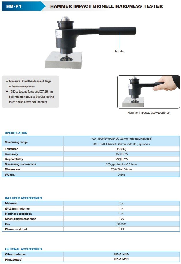 - Measuring range: 100~350HBW (with Ø7.26mm indenter, included), 350~650HBW(with Ø4mm indenter, optional)