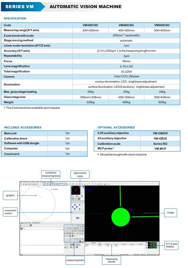 CNC vision machine Technical specification: Measuring range (X/Yaxis): 500×400mm Z axis travel with scale: 200mm(automatic) Stage moving method: automatic Linear scale resolution (X/Y/Z axis): 1µm Accuracy (X/Yaxis): (2.2+L/200)µm Lis the measuring length in mm… Read more