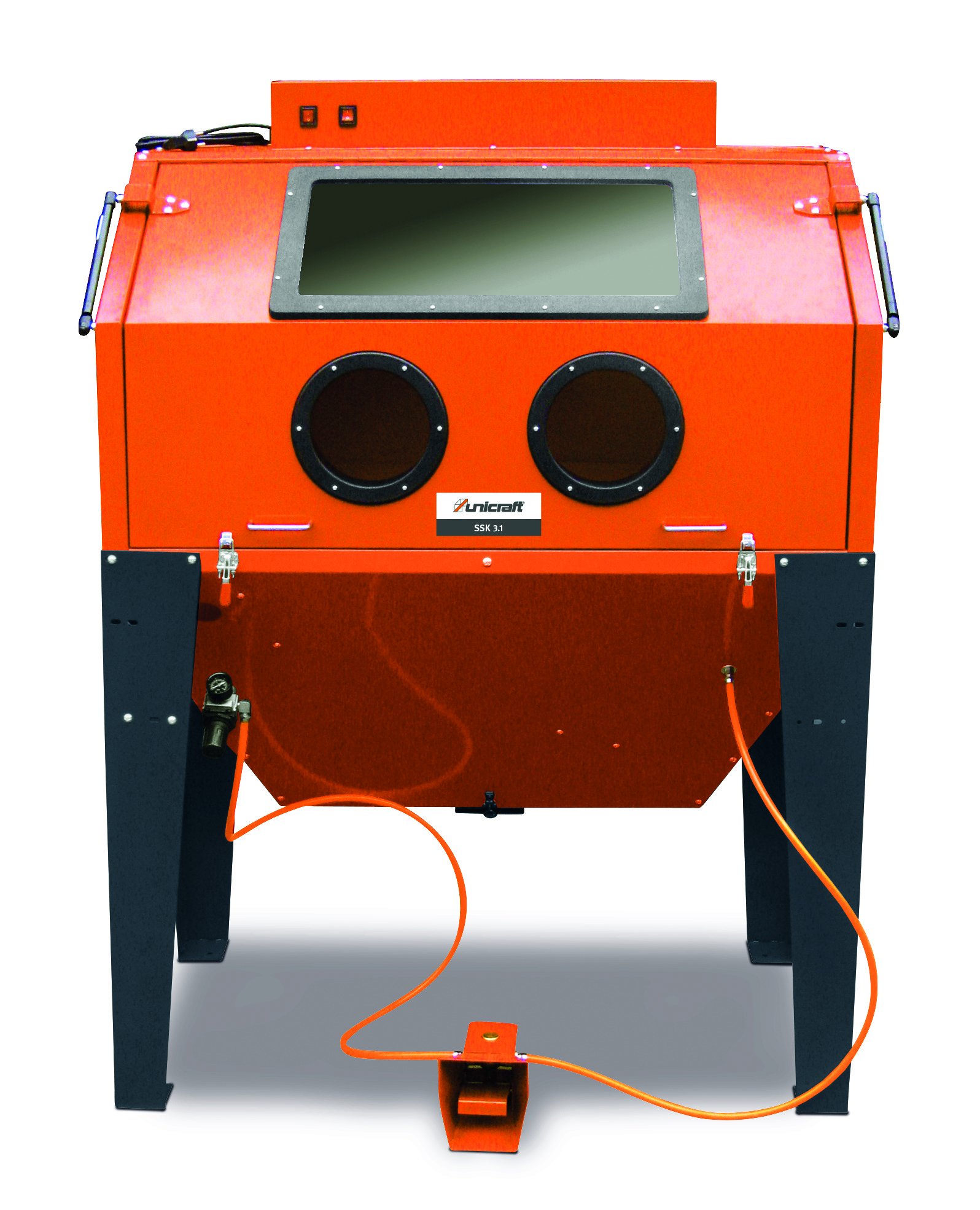 Samostatně stojící box s aktivním odsáváním pro pískování středně velkých předmětů. Vhodný např. k zdrsnění, vyhlazení, k renovacím zašlých povrchů, odstranění rzi, okují, barvy apod.