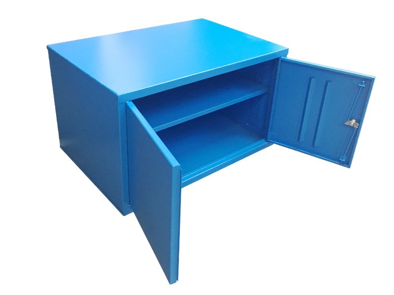The box is designed with a single shelf and is equipped with two horizontally opening doors hinged from the center. The shelf has a load capacity of up to 30 kg. Locking is ensured by a cylinder lock supplied with two keys.